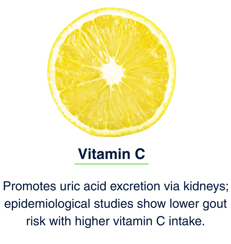 - Vitamin C – helps your kidneys flush uric acid.